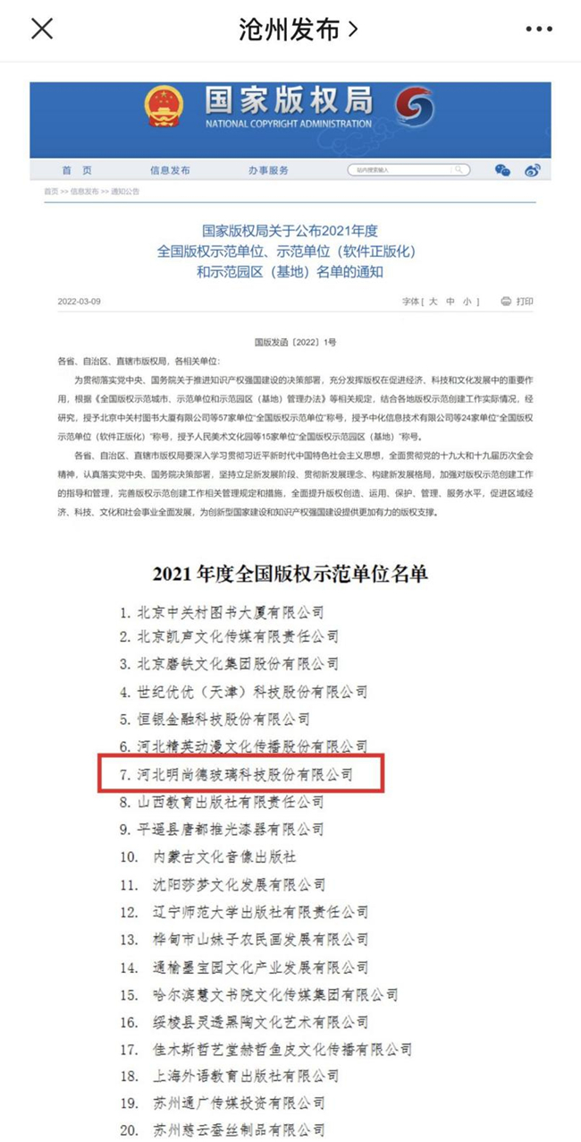 On March 9, 2022, Hebei MSD glass technology Co.,LTD. was awarded the title of "National Copyright Demonstration Unit" by the National Copyright Administration.