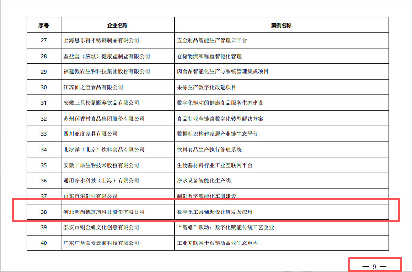 近日,中国轻工业信息中心发布2025年度轻工业数字化转型“领航者”案例名单予以公示,现公示期已过。冀中名企——河北明尚德玻璃科技股份有限公司(简称“明尚德”)申报的《数字化工具辅助设计研发与应用》入选2025年度轻工业数字化转型“领航者”案例(创新应用能力)。