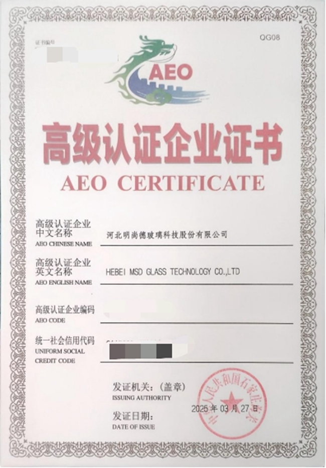近日,河北明尚德玻璃科技股份有限公司取得了中华人民共和国石家庄海关颁发的《AEO高级认证企业证书》,被认证为AEO高级认证企业。AEO高级认证为海关管理企业的高级别,通过后可享受全球互认海关提供的优惠待遇,包括较低查验率、优先办理进出口货物通关手续、申请免除担保等,有利于提升公司竞争力,促进对外贸易合作发展。