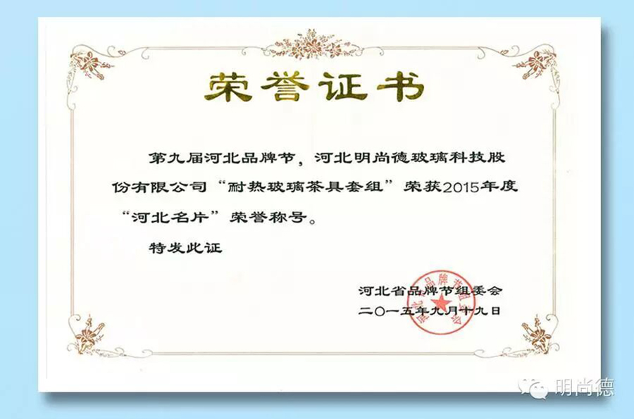 明尚德先后获得“河北省科技型中小企业”“河北省文化产业示范基地”“外贸进出口先进企业”“河北省诚信企业”“河北省安全生产标准化二级企业”“河北省中小企业名牌产品”“耐热玻璃茶具套组”获2015年度河北省“河北名片”荣誉称号。并于2015年7月与清华美院签订了“成果转化和教学实践基地”协议,同时在明尚德公司的大力推动和促进下河间市被成功确定为“中国工艺玻璃制造之都”。