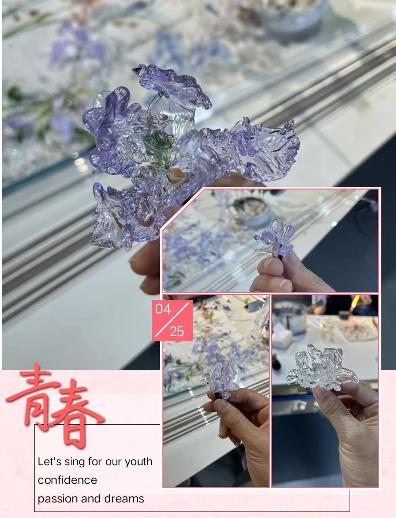 灼灼火焰中,滚烫的玻璃原材在学生手中灵动蜕变,拿捏、旋转、塑形、定型,一气呵成、行云流水,一件件造型精美、灵动雅致的玻璃艺术品制作而成,或简约大气,或精巧别致,尽显玻璃艺术的流光溢彩。